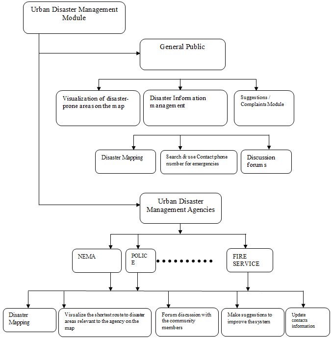 The urban disaster management module : The urban disaster management module provides the relevant tools and technologies for mapping and map-based visualization of disaster-prone areas. It as well provides a social communication hub where the residents of a community can interact with the relevant bodies in case of any disaster or emergency occurrence. The functional breakdown for this module is presented in Figure 7. The stakeholders for this module include the general public whose major role is to make sure that information regarding any form of disaster in their localities gets to the appropriate quarters promptly. To make this possible the system uses both synchronous and asynchronous communication mechanisms such as Google Mashup Apps, discussion forums, hotlines and email addresses. Other stakeholders include the police for terrorist attacks, security tips, safety measures; National Emergency Management Agency (NEMA) for monitoring and management of natural disasters such as erosion, earthquakes, floods, etc. voluntary organizations such as Red Cross and other NGOs who render services to save casualties or victims of disasters; Fire Service Agency for fire incidents.