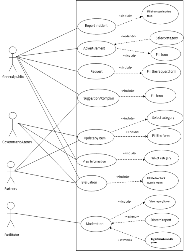 The system usecase diagram : The system usecase diagram is given in Figure 8. In the usecase diagram of Figure 8 , the actors include community members, facilitator, Government agencies and partners.