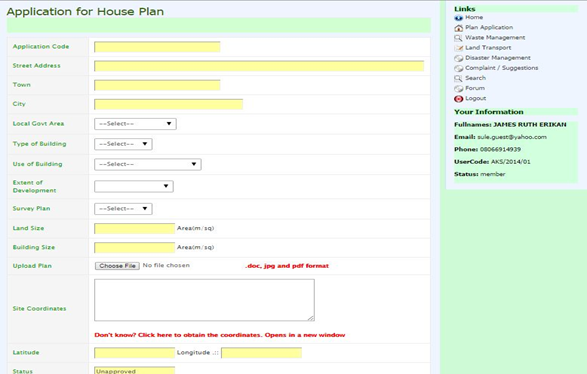 The screenshot in Figure 14 shows the user registration form while screenshot in Figure 15 is for application for land or house plan approval. The screenshot in Figure 16 shows approved buildings in an area, for an agent that wants to verify the status of a building or a user that want to verify for the purpose of conveyance.