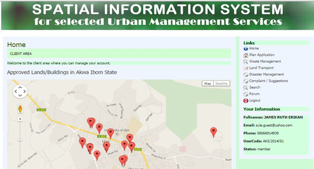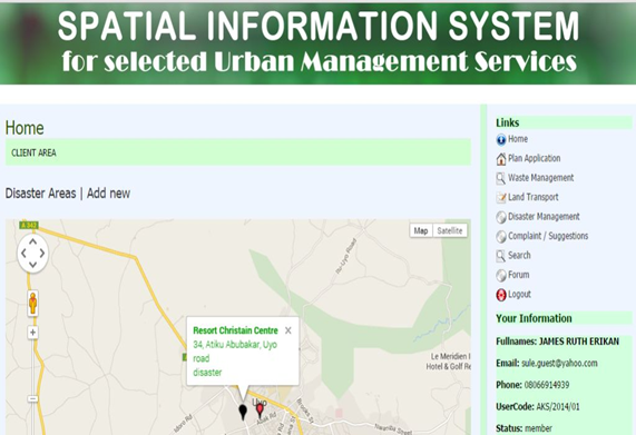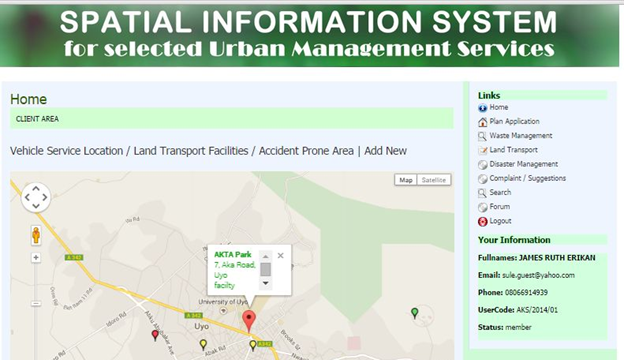 A web-based spatial information system was developed to provide timely information on urban management service in Akwa Ibom state. The urban management services included in the design are disaster management, waste management, land administration and land transportation information hub. The web-based spatial information system can be accessed, viewed and analyzed by both government agencies, public users and other stakeholders that either use or provide services. Furthermore, a third party mapping application was developed using Google map Application Program Interface (API) version 3 to enable the mapping of urban services such as master plan of the city, services and facilities in the city and also disaster-prone areas or areas of disaster occurrence. Other mapping tools such as the geocoding tool were also implemented in the system to facilitate the collection and processing of spatial information. Search tool was also implemented in the system for locating specific services and facilities in the community. The web application was hosted locally using WAMP server and tested with some dataset obtained in the case study area.