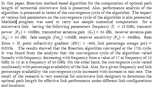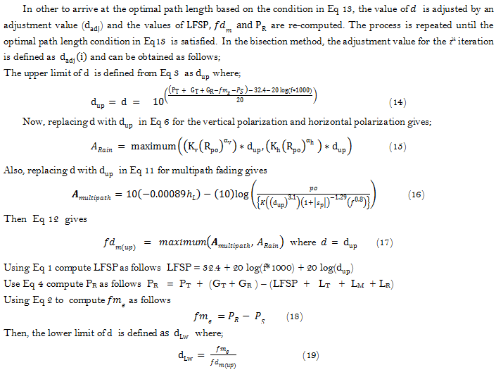 In all, the bisection method can be used to determine the optimal path length of terrestrial microwave link. However, the convergence cycle of the algorithm is affected by various link parameters.