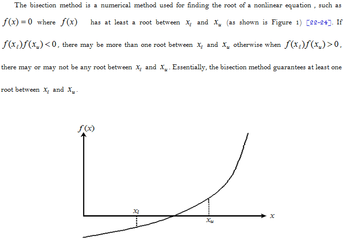 [25] A. Kaw, "Bisection method of solving a nonlinear equation. A Lecture Note at University of South Florida: Holistic Numerical Methods Institute," pp. 2. Available: https://resources.saylor.org/wwwresources/archived/site/wp-content/uploads/2011/11/ME205-3.1-TEXT.pdf. [Accessed 10th November 2018], 2011.