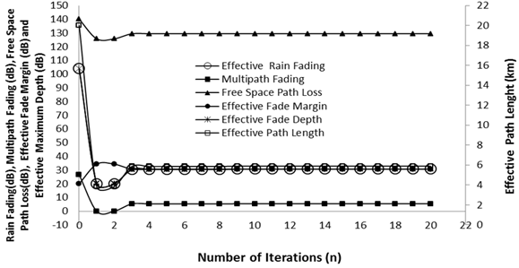 Figure-2. Bisection Method: Rain Fading, Multipath Fading , Free Space Path Loss , Effective Fade Margin , Effective Maximum Depth and Effective Path Length vs Number of Iterations (n)