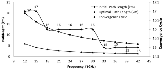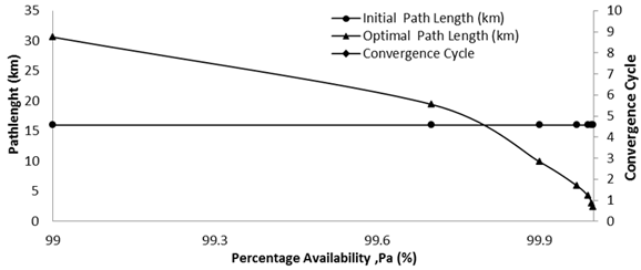 It is observed that as the percentage availability increases the rain fade depth increases and the optimal path length decreases. The convergence cycle is affected by both the rate at which the rain rate varies with link percentage availability and the value of the optimal path length. As such, the variation of the convergence cycle with link percentage availability is not linear.