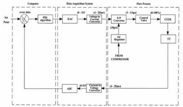 Figure 1 shows the block diagram of a CSTR tank interfaced with a PC. The pneumatic control valve uses air as an input and adjusts the flow of the water pumped to the CSTR jacket from cold water tank. This flow maintains the temperature inside the tank at the desired value. The temperature of the liquid inside the tank is measured with the help of RTD and is transmitted in the form of (4-20) mA to the interfacing DAC module with the help of temperature transmitter to the personal computer (PC) [15-18].