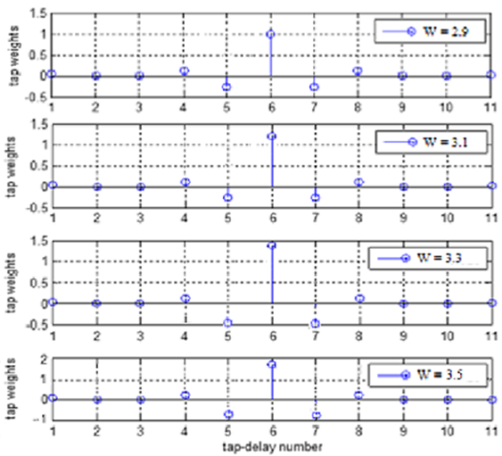 Figure 6 below depicts the optimum tap-weights values obtained after iteration (2500) for each of the four eigenvalues spread. It can be seen that the tap weights of the equalizer for all four eigenvalues are symmetric around 6 since the ATF order is 11. The value of center-tap increases with increasing of the eigenvalue spread and this leads to the conclusion that the change in eigenvalue will affect the impulse response of the ATF.