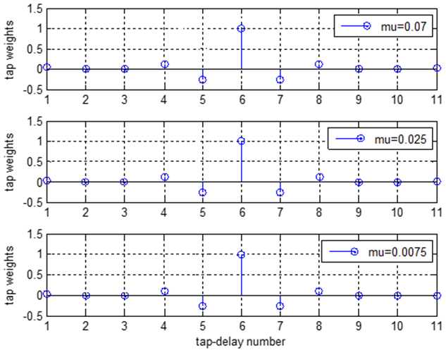 Figure 7 depicts the curves of the LMS algorithm for a fixed eigenvalue spread and varying µ. The value of (w) is kept constant at 2.9 while (µ) takes the values (0.07, 0.025, and 0.0075]. It is crystal clear that the rate of convergence is dependent on the (µ) and the smaller (µ) leads to the reduction of convergence rate and the smaller misadjustment error value. Contrarily, for the bigger (µ) the faster convergence rate is obtained with larger misadjustment error value. So, the selection of the appropriate (µ) is a trade-off between the convergence rate and the misadjustment error and depends on the application that used for. Therefore, the main challenge of this algorithm is the selection of appropriate value for the step size (µ) that guarantees stability [24]. It is obvious from Figure 8 that the tap-weights of the filter are symmetrical around tap-delay number 6.