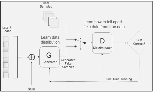GANs contain a generator that generates data and a discriminator that distinguishes them. The generator is designed to generate images from random noise or mapping latent space and is typically a Deconvolutional neural network. The discriminator tells the generated images apart from the real images and is a Convolutional Neural network. By this, both the generator and discriminator are trained, first individually then simultaneously and constant improvements are made through feedback. The target of the generator is to generate such distributions such that the discriminator believes is real i.e. not generated.