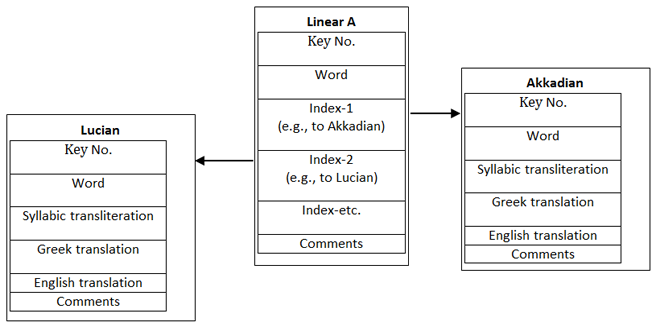 To this end, a digital dictionary consisting of the already existing words from all sources is being created and become available to the researchers, in order to use the software tools either for learning or for the deciphering of Linear A. As a result, by creating a consolidated vocabulary, it will safely lead us to the answer of whether Linear A renders the combinatory result of a variety of already existing languages. Therefore, the developmental process includes a database, along with a transcription in Latin alphabet and the translation of the basic words in English and Greek. Wherever it is necessary, there will be a comment Figure 2.