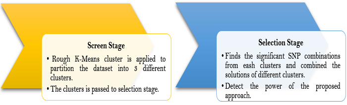The RCSalp – Epi consists of two stages, such as screen and clean stage. The objective of the screen and the clean stage is exposed in Figure 1. The general structural design of the proposed system is expressed in Figure 2. In the screening stage, the rough K-means clustering technique partitions the SNPs into three clusters. These clusters are passed to the selection stage to detect disease related SNP combinations. A detailed description of the screen and selection stage is exposed in section 3.1 and 3.2.