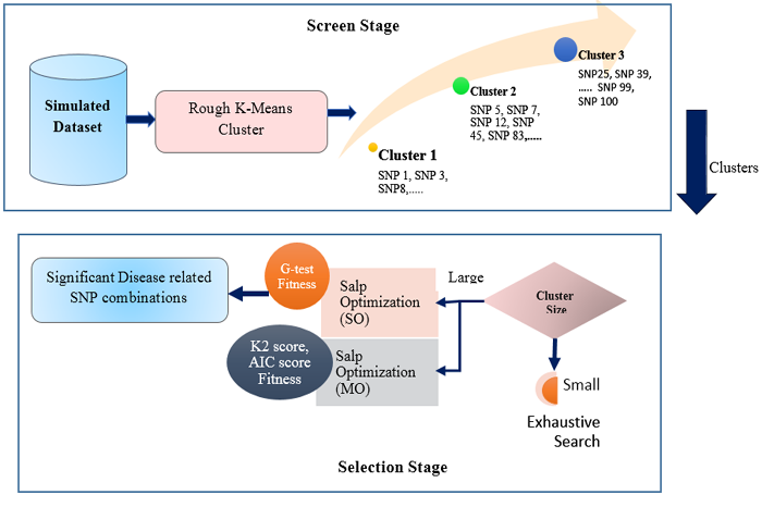 In this section, we formally introduce the two components of RCSalp-Epi approach such as Rough K-means cluster and Salp Swarm Algorithm (SSA) for genetic interactions identification. Rough K-Means clustering technique is adapted in the screening stage to group SNPs into three clusters. The SSA is applied in the selection stage to find high order SNP combinations.