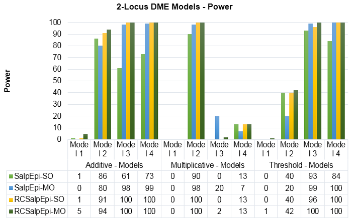 The power of SalpEpi-SO [19] SalpEpi-MO [19] RCSalpEpi-SO and RCSalpEpi-MO for 12 DME models is exhibited in Figure 5. In the additive model, RCsalpEpi-SO and RCSalpEpi-MO achieved 100% power for model 3 and 4. For additive model 1, RCsalpEpi-MO yielded the power of 5%, whereas SalpEpi-SO and RCSalp-Epi gained the power of 1. SalpEpi-MO did not detect any disease causative SNPs. RCsalpEpi-MO obtains the highest power of 94% for additive model 3, which is superior to others.