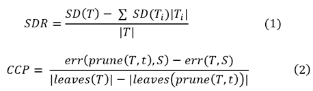 In splitting, a set say T is taken as input and is split into a simpler subset say T1, T2, T3 ….Tn. This approach is recursive in which each sub-split is sub further split into children and the process continues until the number of left instances is very less. This M5 follows a greedy approach for minimization of errors at each internal node in which Standard Deviation Reduction is calculated one node at a time and is given by (1). In the case of the M5 Model Tree, a Standard Deviation Reduction (SDR) is calculated at each node for splitting, and then Cost Complexity Pruning (CCP), shown below (2), is used at each leaf node to remove sections that may not be useful for the final tree, reducing the number of rules [8, 9].