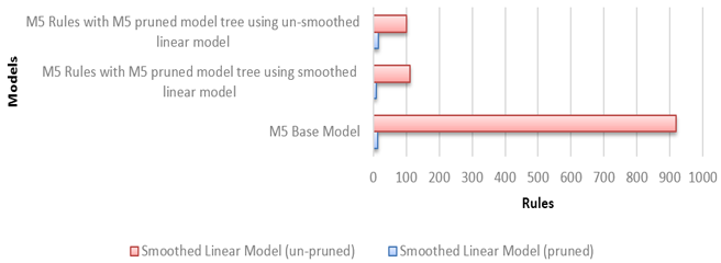 After the data was evaluated, various approaches were applied to the data to check the overall calculation of the data. It was observed that the maximum number of rules generated using the Unsmoothed Unpruned M5 model tree was around 918 and when the pruning was applied and using the smoothed linear model the overall rules drastically decreases to 13 without much effect on the performance as shown in Table 5 above. The clustered chart to compare the number of rules in pruned and un-pruned M5 linear models is shown in Figure 3.