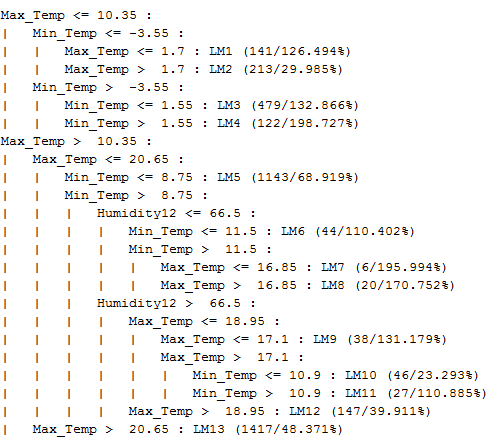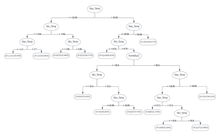 | LM_7 | -2.46 * Max_Temp + 2.23 * Min_Temp + 0.46 * Humidity12 - 0.70 * Humidity3 + 60.4 |
