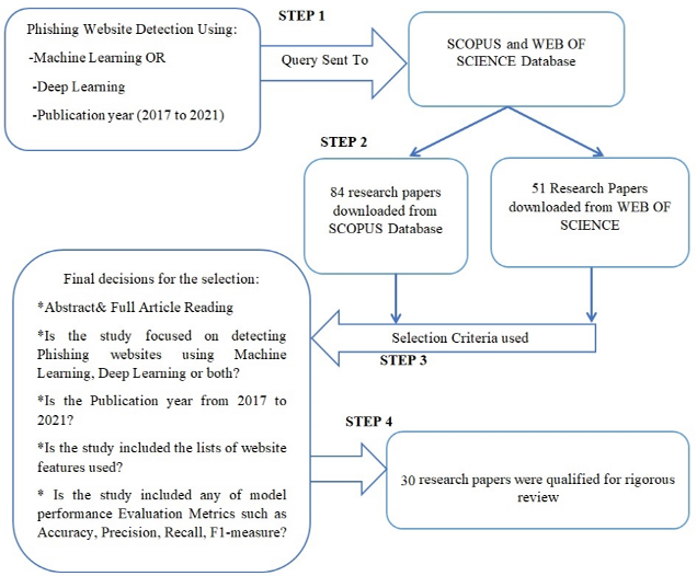 To gain access to relevant studies for rigorous review, we first formulated a search strategy that included "Website" AND "Phishing Detection" AND ("Machine Learning" OR "Deep Learning"), "Phishing website detection using Machine Learning approach”, and “Phishing website detection using Deep Learning approach". Following that, we sent the query(s) specified in the first step to the Scopus and Web of Science databases, where we were able to access numerous research works focusing on machine learning and deep learning-based phishing website detection, and we limited our search to research published between 2017 and 2021 to look for recent state-of-the-art techniques. Based on the aforementioned criterion, we were able to download a total of 135 studies from both indexing databases, i.e. 84 studies from Scopus and 51 studies from the Web of Science Database.