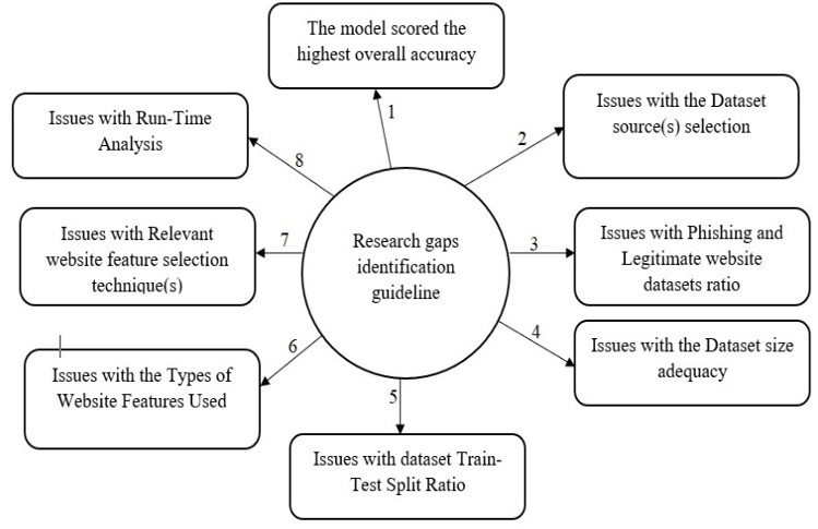 In this study, 10 parameters were used to excavate the key research gaps from criterion-based selected studies, as shown in Table 1. These include: a) Type of Machine Learning or Deep Learning algorithm used, b) Type of Relevant Feature Selection Techniques used, c) Dataset Source, d) Dataset Size, e) Phish-Legitimate Dataset Ratios, f) Percentage of Train-Test Dataset Split Ratios, g) Number of Website Features Used, h) Best Performed Detection Model, i) Accuracy Rate, and Run-time Analysis.