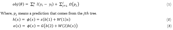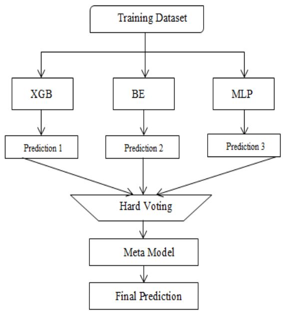 The research study stressed mainly on creating a model that systematically treats the bias-variance trade-offs of a classification model thereby reducing its bias and variance. The study employed a hard voting ensemble that classified the data based upon the class labels and weights associated with each individual classifier taken. The novel voting based Meta-Estimator and Feed Forward Neural Network tries to reduce variance and bias by employing the bagging and boosting techniques. Further, the novel ensemble is used with GINI Importance or Mean Decrease in Impurity feature importance measures for tree models to achieve better classification performance based on accuracy. The proposed classifier takes the integration of the predictions from the Extreme Gradient Boosting or XGBoost (XGB), Bagging Meta Estimator (BE) and the Multilayer Perceptron (MLP). The formula for the functions of these algorithms is given in Equation1, Equation 2 and Equation 3.