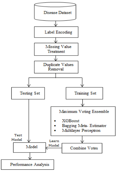 | Procedure: SPLIT_DATA (disease_dataset) train_data, test_data <- train_test_split(diabetes_attributes) return train_data, test_data model_estimators <- [ ] model_estimators.append(XGBClassifier) model_estimators.append(BaggingClassifier) model_estimators.append(MLPClassifier) hard_voting <-VotingClassifier(estimators <-model_estimators) hard_voting.fit(train_data, test_data) procedure: Voting Classifier (hard_voting, train_data, train_label, test_data, test_label) testing_diagnosis <-hard_voting.diagnose(test_data) training_diagnosis <- hard_voting.diagnose(train_data). |