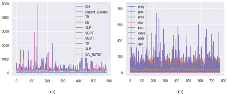 The disease datasets that were used in this research study were acquired from Kaggle data science community. The datasets consist of the Indian Liver Patient Dataset (ILPD) [36] and the PIMA Indians diabetes dataset [37]. The ILPD dataset has 583 records and 10 attributes besides a selector-field that classifies liver patients. It consists of 416 liver disease patients and 167 non-liver disease patients. The PIMA dataset has 768 records and 8 attributes besides a selector-field that classifies diabetic patients. It consists of 500 diabetic patients and 268 non-diabetic patients. Figure 2 shows the features of ILPD and PIMA respectively. Figure 3 gives the pair plot of the disease datasets taken. The figures illustrate the matrix of relationships between each attribute in the dataset. It visualizes the relationships between each attribute present in the ILPD and PIMA datasets respectively, which helped with the immediate analysis of the data.