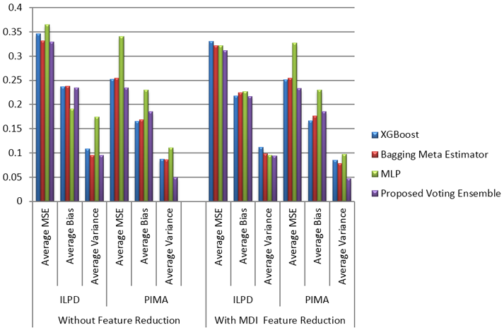 The maximum voting ensemble algorithm proposed in this paper assists in detecting and predicting liver as well as diabetic patients from certain datasets. The algorithms were implemented using the Python programming language. The prediction or output of different base learners was been combined using the maximum voting technique to improve prediction rate. The experimental results show that the hybrid ensemble machine learning model along with the MDI feature reduction technique gave the best accuracy. Also, the MSE of the proposed ensemble along with the bias and variance reduce marginally in the case of the ensemble technique. MDI is an impurity-based feature importance technique and for high cardinality features it can, at times, be ambiguous. Permutation feature importance, also known as the Mean Decrease in Accuracy (MDA), can be used in future to see the influence on the accuracy results. The prediction score depends mainly on the type of the data used to carry out the experiments. We cannot reach a generalized inference or arrange an inception mechanism to summarize that the proposed model achieves better prediction and detection accuracy. For that there is a need for rigorous analysis that takes a larger number of datasets in to consideration. In the future, the proposed model will be used to classify other diseases such as Parkinson’s, Cancer, Alzheimer’s, etc. and infer whether the algorithm is competent or not. Table 7 presents a comparison of our proposed algorithm with the existing approaches for disease classification in terms of accuracy.