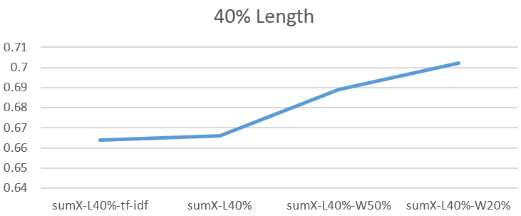 Figure 5 shows the similarity between human and extractive summaries for the 40% length of summaries. The blue line point represents only using TF-IDF algorithm, the orange line represents using a dictionary form that doesn’t use a “word ratio”, the gray line represents adding a dictionary with 50% “word ratio” and the yellow line represents using a dictionary form with 20% “word ratio”.