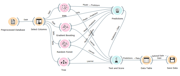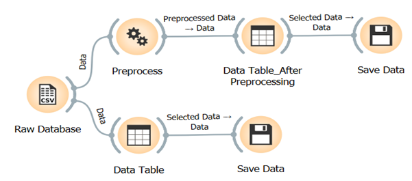 Using the Excel tool, we make our data into a more defined form by removing the unwanted column from the database. Therefore, the Orange tool handled the missing values by imputing the removal of the rows with missing values, as shown in Figure 2. By selecting the parameter assigning missing values, we removed the rows with the missing values in the data. Therefore, Figure 3 shows the basic workflow to pre-process the data using the Orange tool. The raw data was uploaded in the form of a CSV file by using CSV import widgets. After that preprocess a widget was used to remove the missing values in the data and the data table widget was used to visualize the data after preprocessing. To save the preprocessed data, a save data widget was used.