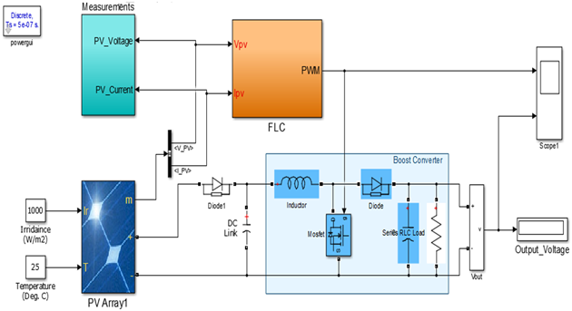 A 100 kW 1000 W/m2 PV generator is connected to a 25 kV grid using a boost DC/DC chopper and a three-phase three-level voltage inverter in this setup. In the boost converter, the MPPT controller is implemented. In this case, We chose the boost type converter since the PV generator can give a maximum voltage of 273.5 volts and a current of 368.28 ampere at the input of the DC-DC converter, and we required 500 volts at the input of the three-phase inverter. The PV generator is made up of 66 PV strings that are joined in series. Each PV string is made up of five PV modules that are linked in series. Each PV module is made up of 96 PV cells that are linked in series.