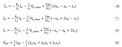 In this paper, a current-controlled three-phase voltage inverter is employed. The boost converter provides a steady DC voltage to the VSI. A three-phase inverter's output voltage is generated by driving the gates and switches. If the inductor currents and capacitor voltage are treated as state variables, the state-space representation [11, 18] of a three-phase VSI coupled to a grid is as follows: