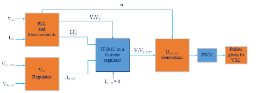 To regulate the gates, VSI requires pulses, which are generated by PWM. VSI control generates these pulses, and the VSI control block diagram is given in Figure 5. PWM takes the three modulating signals Uabc_ Ref as input. The output voltages Vd and Vq of a current controller generate these three modulating signals. Thus, for a simpler control design, transformations for the state space model must be implemented, which can be done via park or transformation.