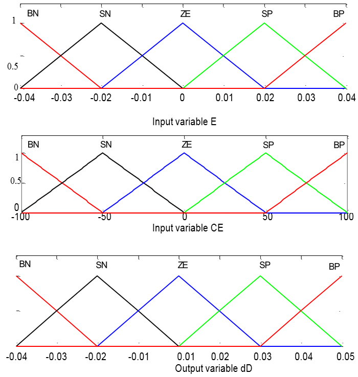 The symmetric triangular form is considered the most suited among the several forms of membership functions (trapezium, Gaussian, and triangular, etc.) Figure 6. The range of fuzzy variables is often adjusted between 1 and +1 by using a gain factor to represent the genuine signals [30-33] . The symmetric triangle form was used for this investigation, and the boundaries were set at 935 [-0.04, 0.04], [-100, 100], and [-0.04, 0.04], respectively, for E, CE, and dD Which represent the error between the inputs and the outputs where dD is the output barycenter calculated by defuzzification.