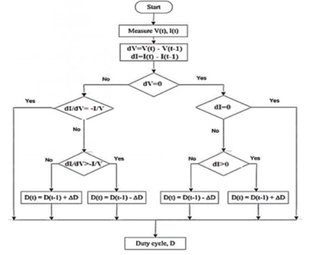 The conductance increment (IC) algorithm is a traditional MPPT method that employs two probes to monitor the PV module's operational voltage V and current I. This method is based on the fact that at the maximum power point (MPP), the derivative of the output power P with respect to the voltage V of the PV module is equal to zero [6, 11]. As a result, we have the following equations: [6, 21].