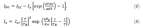 Equation 2 argues the PV cell's output current I_PV and Equation 3 presents a saturation current Io are calculated as: