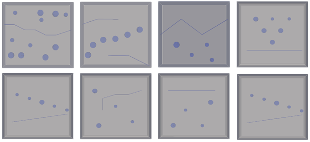 The dataset, which contains 20 simulation scenarios, is generated using the gprMax program. Eight of these simulation scenarios are shown in Figure 3 to prevent confusion. Each scenario is scanned as shown in Figure 2b. A transmitter and receiver antenna pair is moved across along-track dimensions between 10–70 cm, which creates a B-scan. Each time the pair is finished scanning the along-track dimensions, it is moved 5 cm in the cross-track dimension and scanned again. This process is repeated 14 times in a cross-track position simulating an antenna array with 14 transmitter and receiver pairs. Thus, one C-scan consists of 14 B-scans for each scenario. In each simulation, some wires have different orientations and clutter modeled as spheres at different depths.