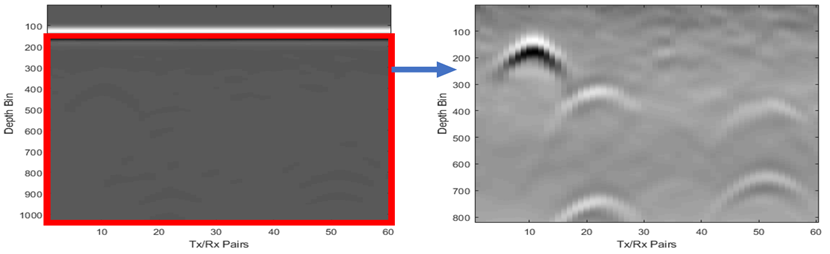 Due to computational requirements, the removal algorithm of this reflection must be accessible and practical. The reflection time of this signal is equal to the one-way electromagnetic wave propagation, which depends on the distance between the transmitter (Tx)/receiver (Rx) antenna pair and the ground [2]. In case of a constant distance from antenna pairs to the ground, such as a ground vehicle mounted GPR, the time index of the reflection signal would always be near the same depth bins. This time index of reflection could be used as a constant gating index. However, the time index could change when the vehicle is in motion. In addition, the GPR signal reflected from the ground always has a higher value than the searched targets. Therefore, the peak of the reflection must be tracked, and the B-scan must be gated according to this peak.