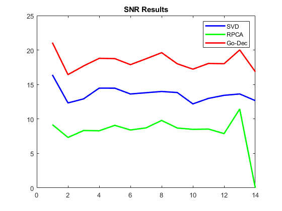 A time comparison is made with the same scenario used in the SNR comparison. The RPCA method is much slower than the singular value decomposition (SVD) and GoDec methods. The SVD is the fastest algorithm to work with for this study. However, the time difference between the SVD and GoDec could be ignored since the SNR of GoDec is better than the SNR of SVD. The comparison results are shown in Figure 8.