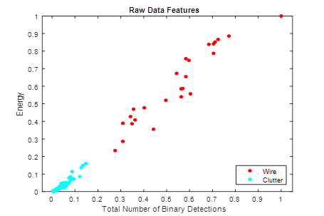 The clustering method is studied for detecting an object and deciding whether it is a wire. For the clustering, there should be some features to utilize. Yılmaz [2] explains in detail which features might be used for wires. We use energy and the total number of binary detections. Based on these features, raw data of the simulation scenarios are shown in Figure 11. Feature datasets are normalized to avoid confusion.