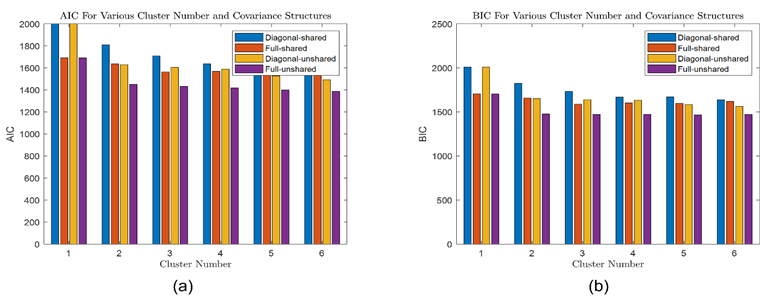 Figure 7. Evaluation of best cluster number: (a) AIC results with respect to different covariance structures; (b) BIC results with respect to different covariance structures.
