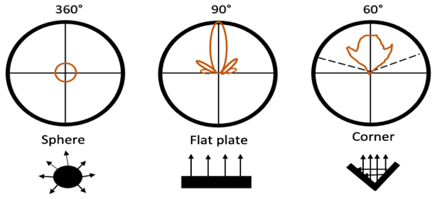 In Figure 1 shows that the sphere is essentially the same in all directions. Flat plates have little RCS unless they are aimed directly at the radar. A corner reflector's RCS is almost the same as a flat plate's, but at a larger angle. Many targets such as ships and planes often have reflective corners. An aircraft is complex because it has many reflective elements and shapes. The RCS is important to aircraft because the radar is the leading equipment to detect and track them. Radar cross section of an object,