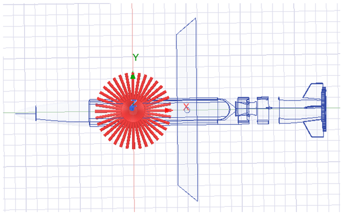 According to radiation pattern results, all frequencies were increased, especially 4 GHz, as seen in Table 1 and Table 4. An intense radar cross-sectional area increase is observed in the wing region of the missile in Figure 14. MALD platform RCS results with 7 antennas.