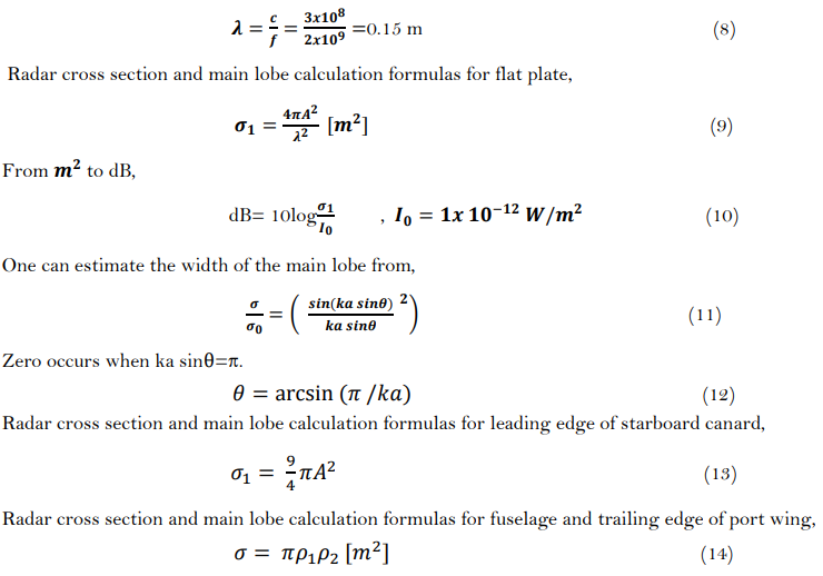 In previous studies, the radar signature has been tried to be reduced in wideband using a microstrip slot antenna array. Using parasitic elements or removing some resistive elements increases the gain. However, it was emphasized that the cross section of the monostatic radar also varies due to the onset of grating lobes  [1]. One of the methods that increase or decrease the radar cross-sectional area is the shape and material type of the material. The material used on fighter aircraft and the curves of the aircraft affect the performance of the radar cross section [2, 3]. Another method used to analyze the radar cross-section is the physical optics method. To use this method, analyzes are performed using cylinder and conical objects that represent the body of the missile. When this method is used on stealth aircraft, a decrease in the radar cross-sectional area is detected and the visibility of stealth aircraft is reduced [4]. Radar cross section analyzes are also performed with the scaled model of the targeted model. Since the scale is getting smaller, analysis close to reality can be made by increasing the frequency. A method developed for bistatic RCS measurements via Terahertz (THz) waves. In one study, the F-16 warplane was scaled down and analyzed. By scaling wavelengths and models to real-scale platforms, detailed comparisons can be made with RCS of life-size aircraft at standard Megahertz (MHz)/ Gigahertz (GHz) frequencies [5]. When considering the studies, analyzes were made to reduce the RCS area. However, the radar cross section should be high to increase the MALD platform's deceptive effect against enemy forces. Increasing the RCS of MALD platforms on aircraft operating in the operational area in a specific direction is an active protection method against radar-guided threats. These decoy missiles can deceive, confuse, or even temporarily blind various radar and air defense points.