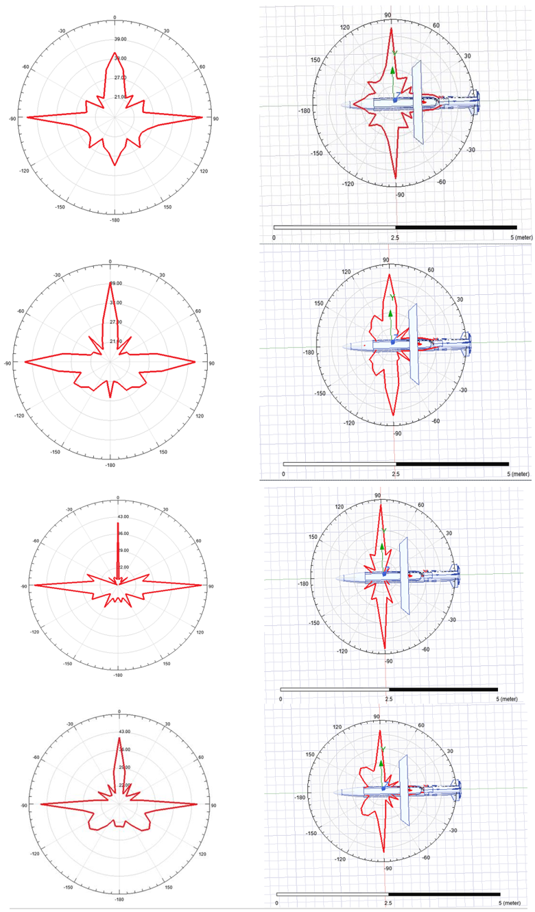 At the same scan intervals, the range of the phi angle is adjusted to 0 -360 degrees, the theta angle is 90 degrees in Figure 4 and the aircraft's radar cross-section results are observed.