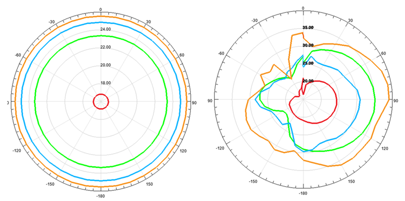 Secondly, seven microstrip antennas used on the MALD platform to imitate B-52 Stratofortress. Seven microstrip antennas, which had good results before, were wrapped conformally to the missile's fuselage in Figure 13. A separate port was created for each antenna, and the distance between them was equal. Analysis performed for 1,2,3 and 4 GHz. As seen in Figure 12, if antennas are not active, the result of the missile RCS is on the left side, and if antennas are active, the result of the missile radar cross section in the right side.