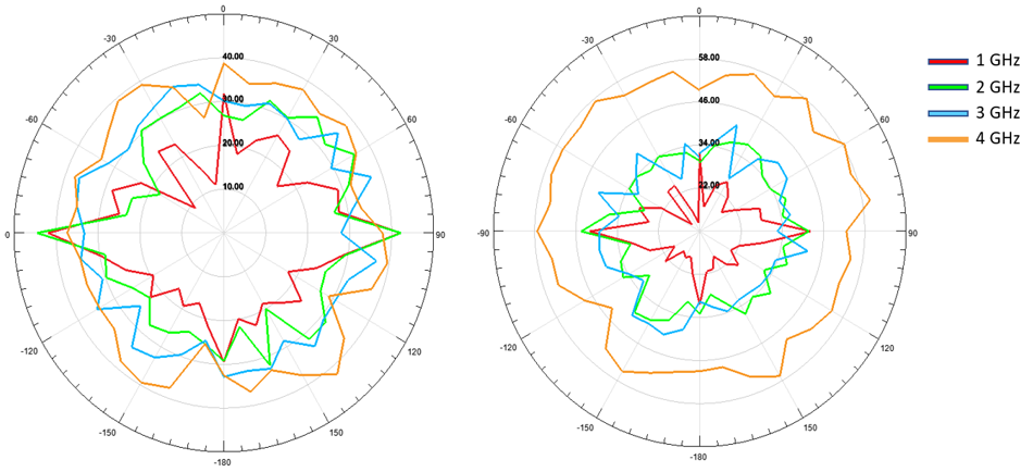 When the number of antenna increased to 4, the reflectivity level became evenly distributed in all directions, and the RCS level for frequencies 1,2,3 and 4 GHz showed in Figure 8. The maximum RCS is seen at 2 GHz.