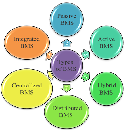 There are several types of BMS, which are used to monitor and control the performance and health of batteries in various applications. Figure 3 illustrates some common types of BMS; these include [7] :