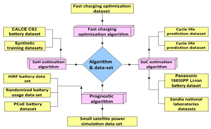 To calculate the life of a battery, the various data sets employ a few algorithms, such as the fast-charging dataset algorithm, state of health (SoH) estimation algorithm, state of charge (SoC) estimation algorithm, and prognostic algorithm. Figure 4 shows the algorithm used by the different datasets.