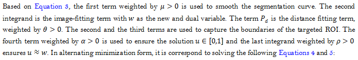 Jumaat and Chen [11] proposed a new minimization problem in the primal-dual framework, termed the Primal Dual Selective Segmentation (PDSS) model, allowing them to obtain a fast solution. The model is expressed as the following Equation 3: