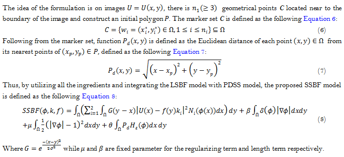 As stated in the previous chapter, the PDSS model was the reformulated version of the CDSS model by Spencer and Chen [10]. The method was defined as an unconstrained minimization problem and significantly uses the Euclidean distance function in its function, which helps to selectively segment the targeted object in the given images. However, the PDSS model is unable to segment intensity inhomogeneity images. For example, in Figure 3 (7b), the PDSS model is unable to segment appropriately due to severe intensity inhomogeneity in the given image. Even though the PDSS model uses the Euclidean distance function to find a specific object, it does not include local intensity information or bias field correction, which are important for separating images with different levels of brightness.