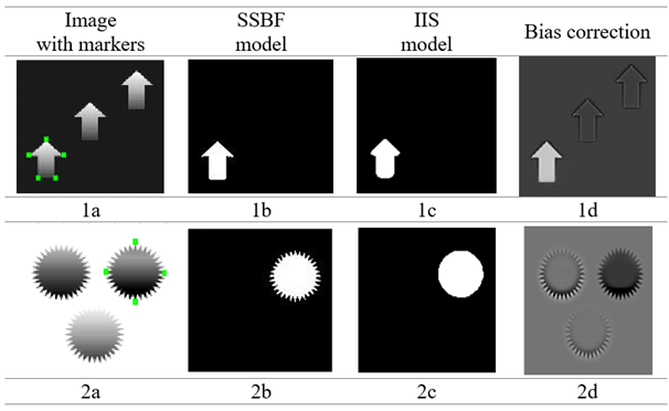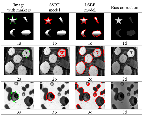 Figure 1 demonstrates the segmentation results between the SSBF model (1b-3b) and the LSBF model (1c-3c) in the second and third columns, respectively, with bias correction images in the last column (1d-3d) based on the input images in the first column. The targeted object is indicated by the green marker in the given images (1a-3a).