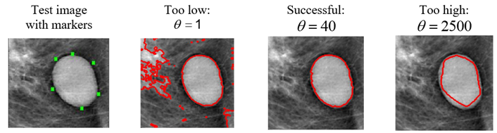 Figure 4 illustrates the outcome of the segmentation results using different values parameter . It shows that when the parameter is too low, the result of the segmented region will be over-segmented resulting in difficulties in interpreting the important information in the image [3]. As we can see, the background tissue of the mammogram image was segmented too due to the small parameter  used. Meanwhile, if the parameter  was too large (=2500), the segmentation of the targeted object would result in an undesirable polygon. Therefore, the optimal value of parameter for this test image is = 40 as shown in Figure 4. According to Jumaat and Chen [25] and Jumaat and Chen [26], the parameter  must be regulated in order to obtain a successful result from segmentation.